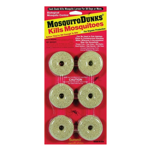 Use Summit Mosquito Dunks in ponds or standing water to kill mosquitoes and black fly larvae for 30 days or more. While the Mosquito Dunks float, they slowly release a long-term biological mosquito larvicide, BTI, killing the larvae before they hatch into adults. This biological mosquito control is safe for use around children, fish, pets or wildlife. Treats up to 100 square foot of water surface.